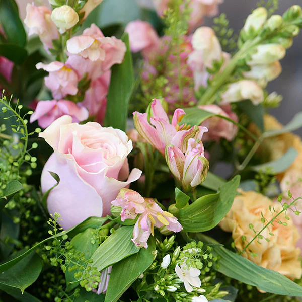 Indulge in the enchanting allure of 'A Parisian Romance' – a captivating hand-tied bouquet that combines the timeless beauty of pink and cream blooms. This exquisite arrangement features delicate snapdragons, elegant pink roses, fragrant dianthus, vibrant alstroemeria, and the refreshing touch of eucalyptus. With its harmonious blend of pink and yellow hues, as well as creamy tones, 'A Parisian Romance' offers a versatile and dreamy floral display that's perfect for any occasion. Whether you're expressing love, celebrating a special moment, or sending warm wishes, this bouquet is a symbol of elegance and affection.