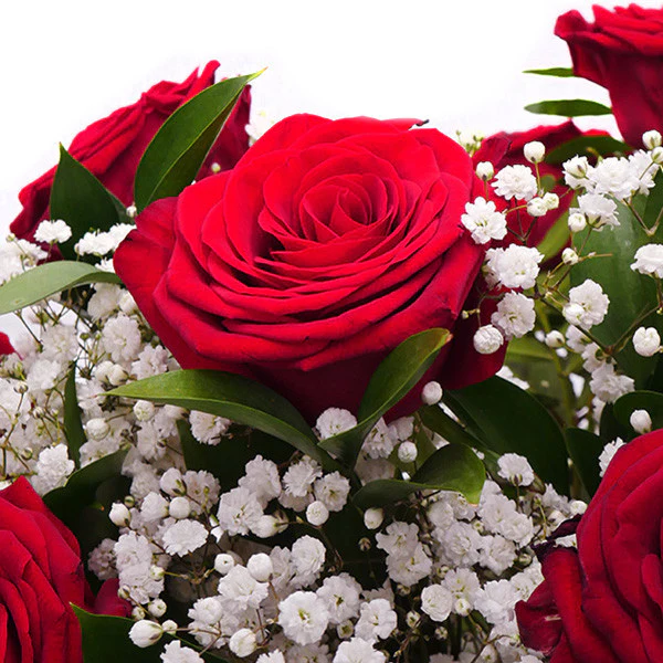 9 Roses: x9 Red Ecuadoria Roses, x4 Gypsophila, x9 Ruscus