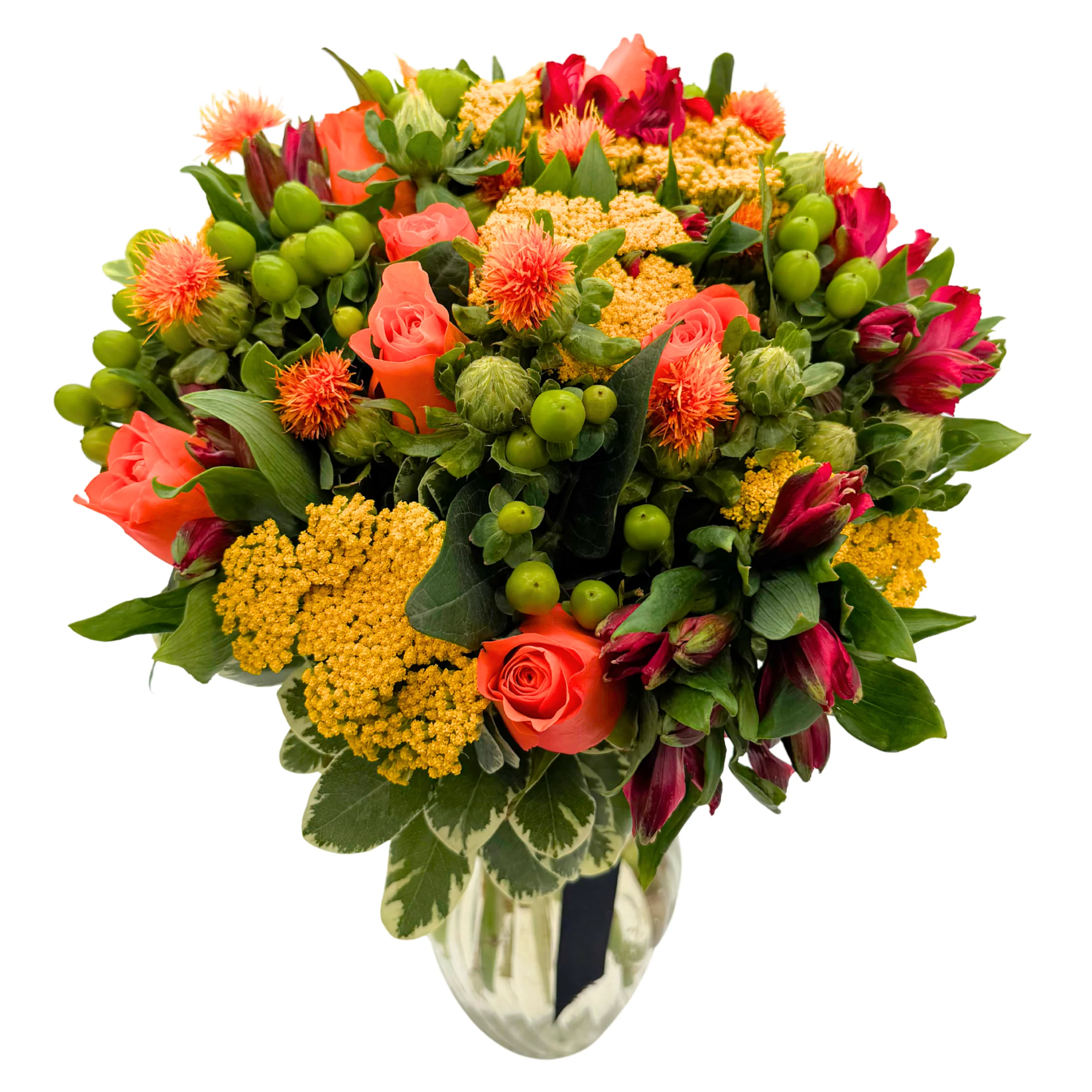 CONTAIN: x10 orange african rose, x5 green hypericum, x5 red alstroemeria, x5 achilea, x5 orange carthamus, x5 pitto