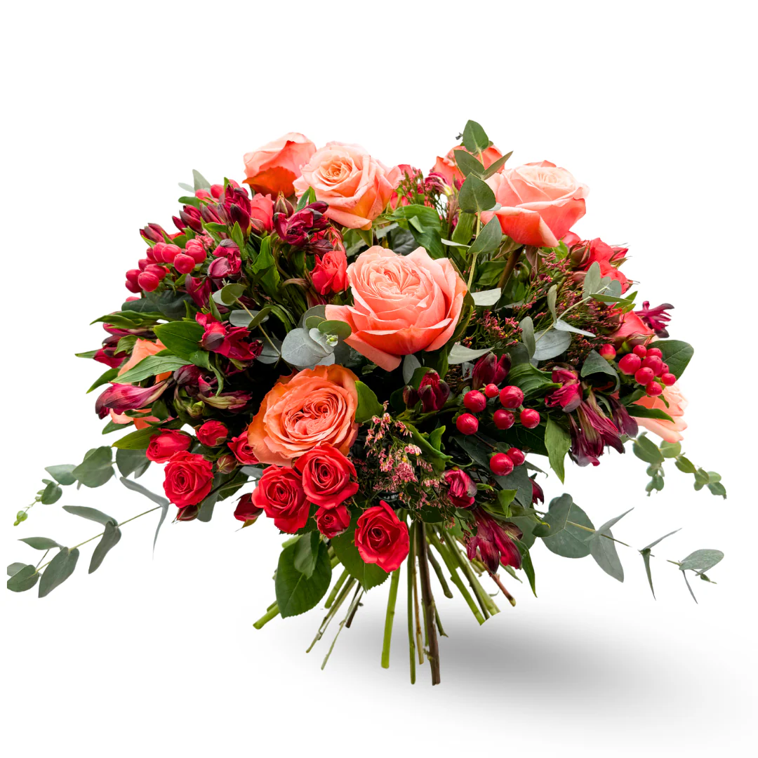 STANDARD: x5 kahala ecuadorean roses, x5 red limonium, x3 coral spray rose, x5 red alstroemeria, x10-15 mix greenery