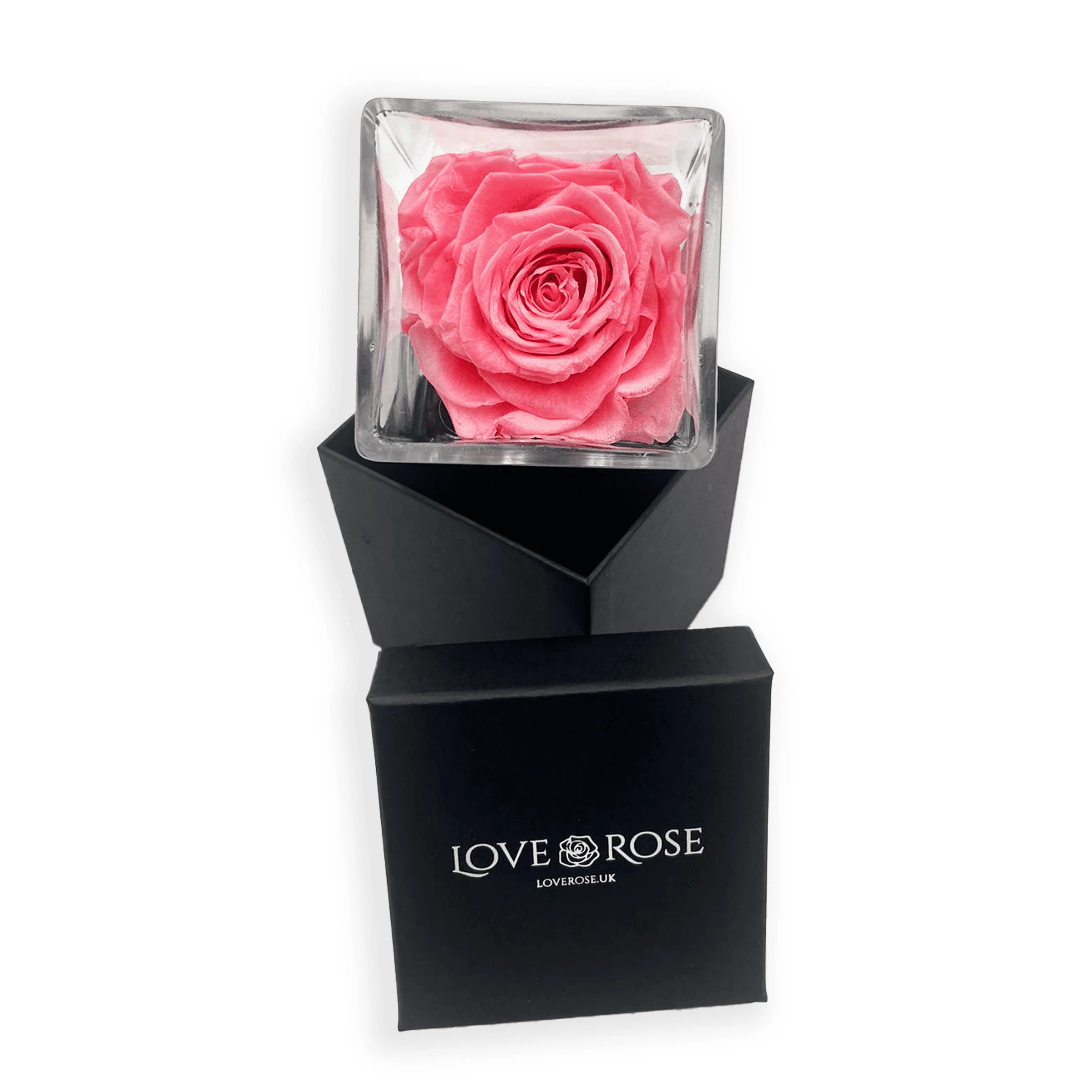 A single pink rose head in a luxurious clear vase makes for the perfect gift for someone special. Whether it's for special occasions or Valentine's Day, you have the option to choose between luxury fresh roses or everlasting infinity pink roses, which can last from one year onwards.