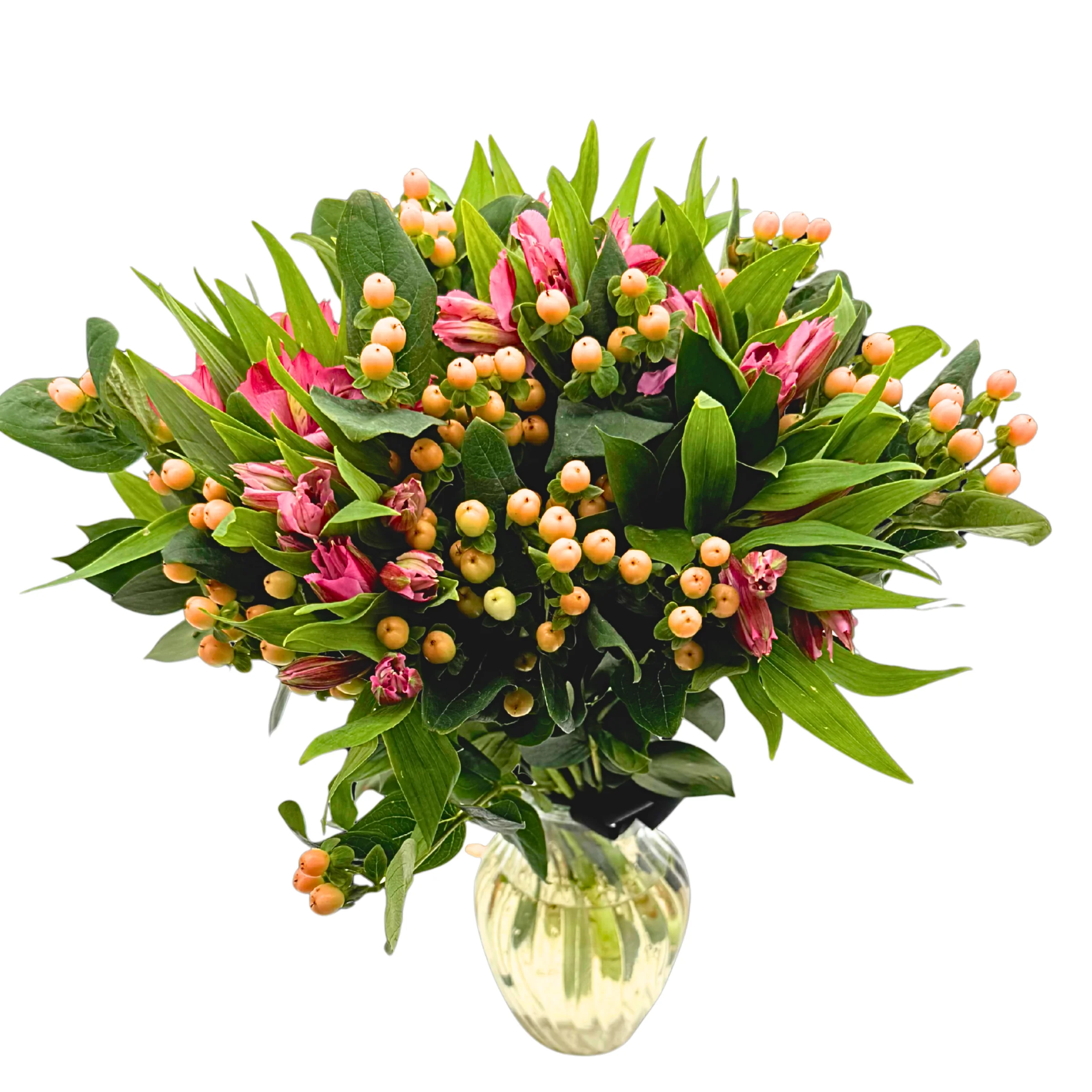 CONTAIN: x7 pink hypericum, x10 red alstroemeria, x15 ruscus